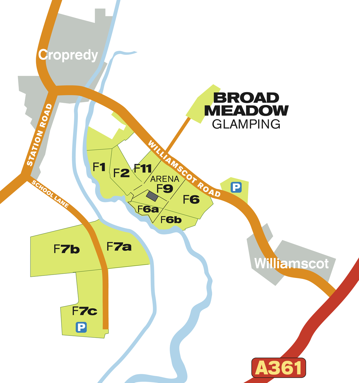 Cropredy is approximately 4 miles from Junction 11 of the M40. Please follow the AA (black lettering on yellow background) signs.